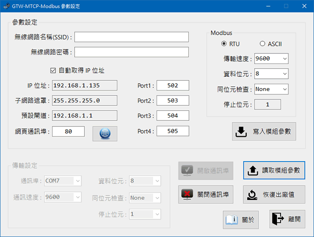 | 提供「工具軟體」、「網頁瀏覽器」、「安卓 App」,可以很迅速的完成系統架構設定。 「工具軟體」參數設定 GTW-MTCP-Modbus.exe (v1.0.0.0)![]() 「安卓App」參數設定 GTW-MTCP-Modbus.apk (v1.0.0) ![]() Web參數設定 ![]() 1. 基本參數設定 ![]() 2. 進階參數設定 ![]() |