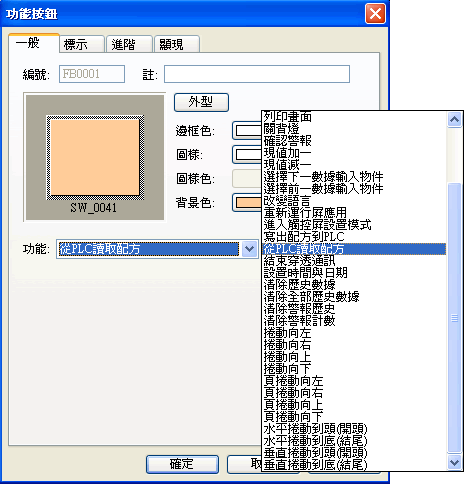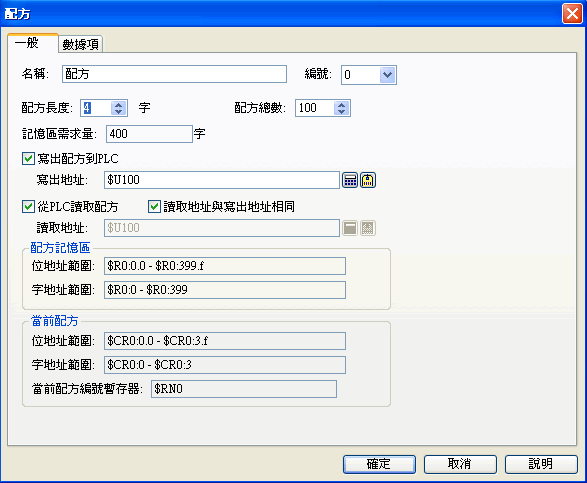 PanelMaster 提供了二種方式來存取配方資料,方式一,利用 "功能按鈕" 來存取配方資料,不用撰寫程式就可以達到您所要的需求;方式二,利用 "命令與狀態" 來存取配方資料,必須配合PLC撰寫程式。建議!!使用方式一,簡單又迅速.... 另外又提供了1∼15區的配方區可供設計者使用。