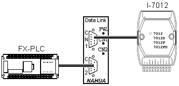 | 範例五: | FX-PLC (FX2N,FX1N,FX1S系列),透過資料交換器與I-7012連線,不需要撰寫任何通訊程式,就可以讀取類比資料。 |
