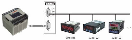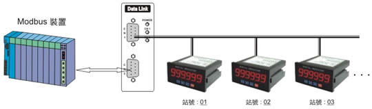 | 範例八: | Modbus-Slave 裝置,透過資料交換器(DataLink)與RS485顯示器(MT-S9)連線,不需要撰寫任何 通訊程式,就可以設定儀錶數值。 | |