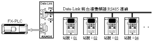 | 範例四: | 您還在使用A/D,D/A 控制變頻器嗎? FX-PLC (FX2N,FX1N,FX1S系列),透過資料交換器與台達變頻器通訊埠連線,不需要撰寫任何通訊程式,竟而達到控制變頻器的頻率及顯示輸出頻率及輸出電流。 |