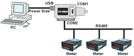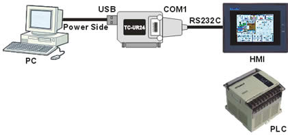 | c. COM1(PC/RS232) to COM2 (RS232/422/485) PLC. d. PC (USB) to COM2 (RS485) devices. |