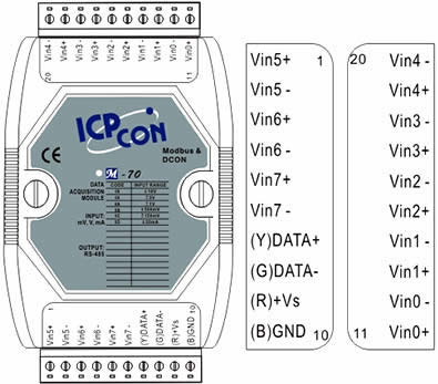 Input •Channels: 8 differential •Input type: mV, V, mA (requires optional external 125 ohm resistor) •Input range: ± 150mV, ± 500mV, ± 1V, ± 5V, ± 10V and ± 20mA •Resolution: 16-bit •Sample rate: 10 Samples/Second •Bandwidth: 15.7 Hz •Accuracy: ± 0.1% •Zero drift: ± 20uV/°C •Span drift: ± 25ppm/°C •CMR @ 50/60 Hz: 86 dB min •NMR @ 50/60 Hz: 100 dB •Input Impedance: 20M Ohms •Over voltage protection: ± 35V •Isolation: 3000Vdc •Indication LED Light For power and communication •Support Modbus and DCON Protocol Communication Interface •RS-485 Power Supply •Input Voltage Range : +10~+30Vdc •Power Consumption :1.3W |